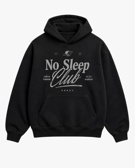 The No Sleep Club Graphic Hoodie is a bold streetwear piece made to stand out. Featuring a strong front graphic on a black oversized base, it delivers attitude, energy, and an urban edge. Perfect for statement looks with a confident, modern vibe.